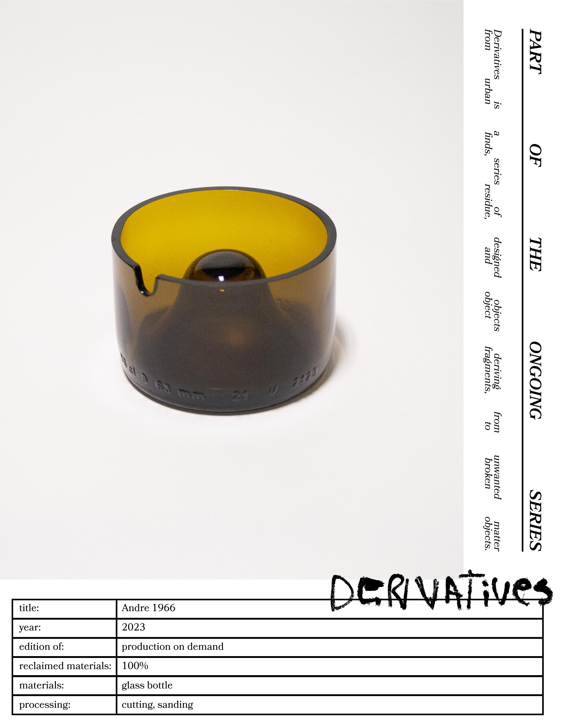 "An amber-colored cylindrical object made from upcycled glass, featuring a central dome and a small notch on the rim. The piece, designed by Jannis Schäfer Studio, is inspired by the Copenhagen ashtray by André Ricard and belongs to a series titled 'Derivatives'. The object highlights the use of reclaimed materials.”